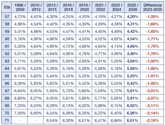 Nuovi coefficienti di trasformazione per il biennio 2025-2026: riduzioni tra l’1,5% e il 2,2%