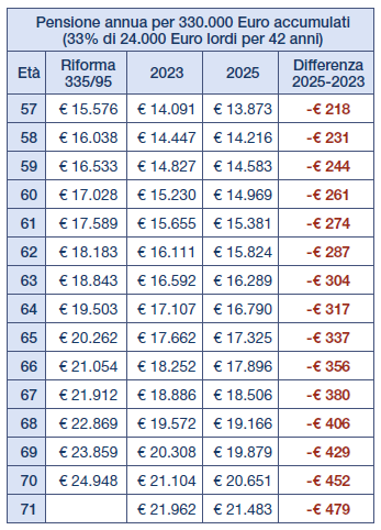 I coefficienti inizialmente introdotti dalla L. 335/1995 erano definiti per le età da 57 a 65 anni, allora rappresentavano le possibili età di pensionamento. I successivi aggiornamenti, questo è il settimo dalla loro entrata in vigore, invece, prevedevano coefficienti per le età comprese tra i 57 anni e i 70 anni. Mentre, a partire dall’aggiornamento 2019 è stato pubblicato anche il coefficiente per i 71 anni di età, così come previsto dalla Riforma Fornero1, per tener conto degli incrementi per la speranza di vita (2013; 2016; 2019) che hanno comportato un incremento complessivo per l’appunto di un anno. A titolo esemplificativo riprendiamo un semplice esempio per meglio comprendere ciò che accadrà per i soggetti che andranno in pensione nel biennio 2025-2026.